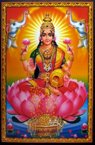 Lakshmi is depicted as a beautiful woman of golden complexion, with four hands, sitting or standing on a full-bloomed lotus and holding a lotus bud, which stands for beauty, purity and fertility. Her four hands represent the four ends of human life: dharma or righteousness, “kama” or desires, “artha” or wealth, and “moksha” or liberation from the cycle of birth and death.