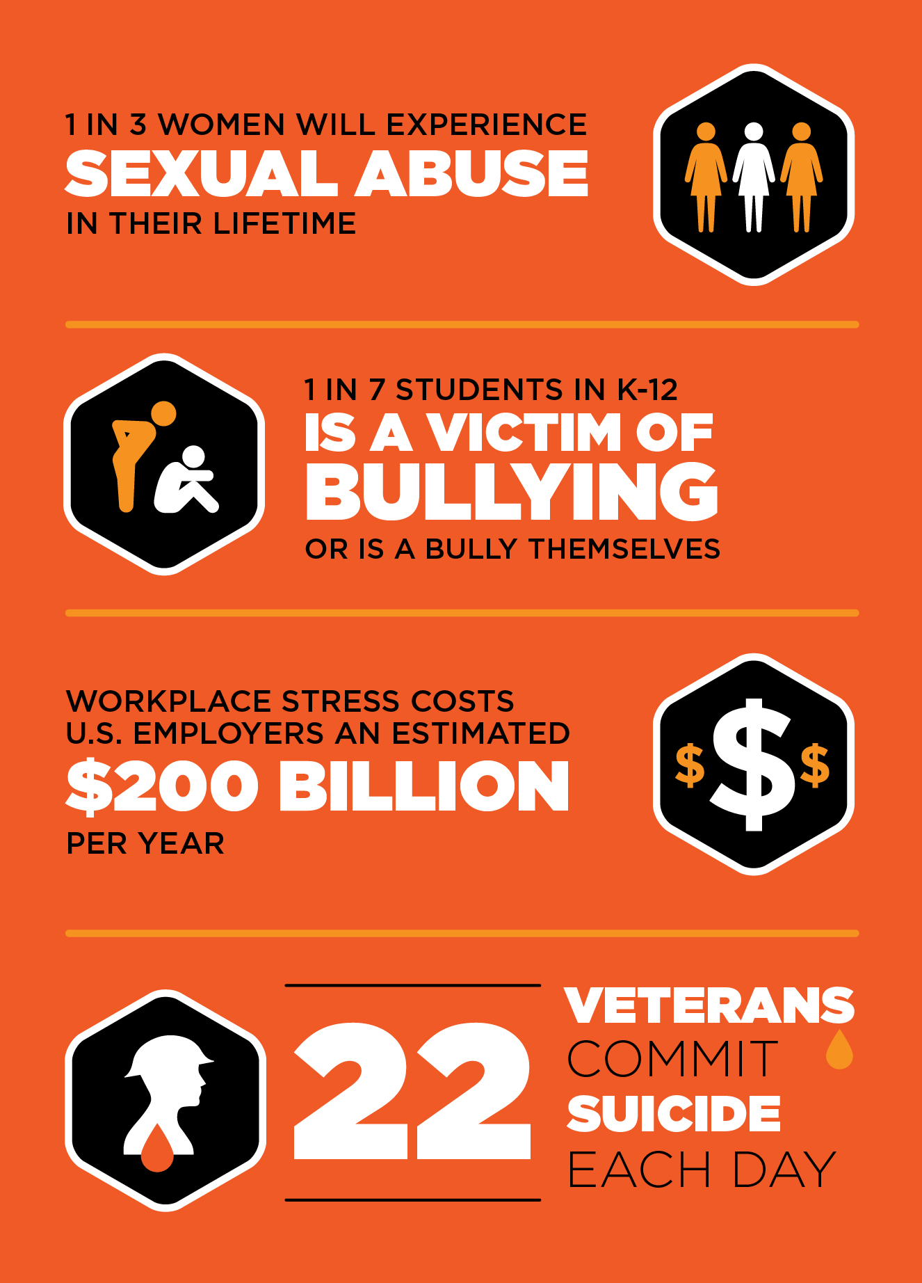 I got these stats from the stress free violence free campaign website and I must say – these stats are really shocking. 1 in 3 women will experience sexual abuse in their lifetime! 1 in 7 students in K-12 is a victim of bullying or a bully themselves! Workplace stress costs US employers an estimated 22 billion dollars per year! 22 veterans commit suicide each day! Each day! Here are some interesting facts on Stress.