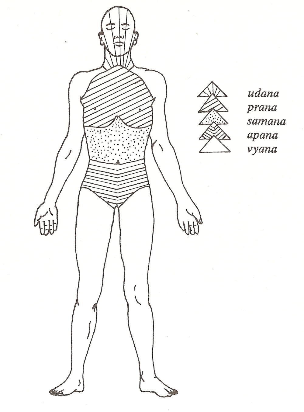 5. Vyaana – This pervades the whole body and acts as reserve energy. It helps all the other pranas when they require an extra boost. When one overexerts and feels extremely tired, a rush of energy comes, which enables one to continue. When vyana, the expansive energy, is unbalanced, there is lack of coordination, tremors, inability to reach out to people, and the mind is erratic.